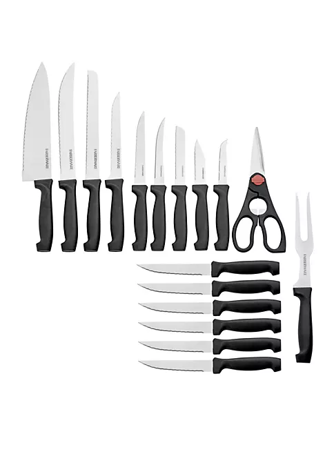 This Farberware 18-Piece Never Needs Sharpening Cutlery Block Set has everything you need to complete your kitchen prep work. The knives feature a high-carbon stainless steel blade for strength and durability and the textured non-slip handles provide a sure grip, even with wet!