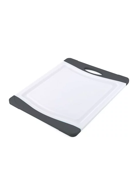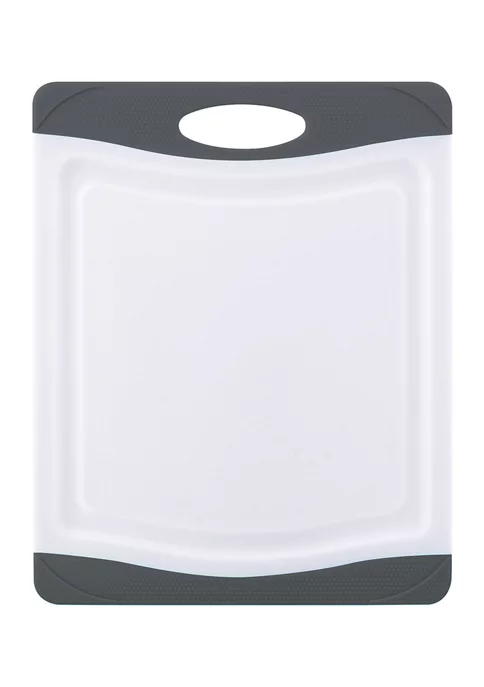 Farberware’s 8-inch by 10-inch white cutting board with grey trim is ideal for tackling everyday food prep tasks. Made of polypropylene plastic, it is stain-resistant and non-absorbent, so it won’t retain odors. It is also gentle on blades so it won’t dull knives, and reversible to double the cutting surface, and help prevent cross-contamination. Drainage grooves frame the board to catch juices and cut down on messes, and the board has non-slip Santoprene edges that provide stability on countertops while in use.