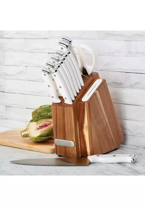 Always have the right sharpened knife on hand, with this Farberware Triple Rivet White Slim Cutlery Acacia Wood Block Set with Built-In Edgekeeper® Sharpener. Each knife has a fine edge, high-carbon stainless steel blade, and ergonomically designed plastic handle that provides a comfortable grip. The slim design saves counter space, and the set features white handles with triple rivets and endcap accents in an acacia wood block that complements any decor and keeps all your essential knives organized and within reach on your countertop. This unique block also features an Edgekeeper® Sharpener slot. If you need to sharpen a blade, simply slide it in and out of the slot for a quick and convenient edge enhancement. 14-piece set includes 8-inch chef knife, 8-inch slicing knife, 5.5-inch serrated utility knife, 5.5-inch fine edge utility knife, 3.5-inch paring knife, 3-inch birds beak paring knife, six 4.5-inch steak knives, all-purpose shears, and acacia wood storage block with a built-in sharpener. Hand-wash knives with warm water and a mild detergent then rinse and dry immediately. Stainless steel knives are not dishwasher safe.