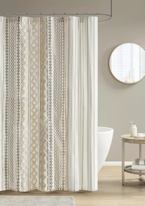 • 100% cotton printed with tufted chenille stripe trim shower curtain