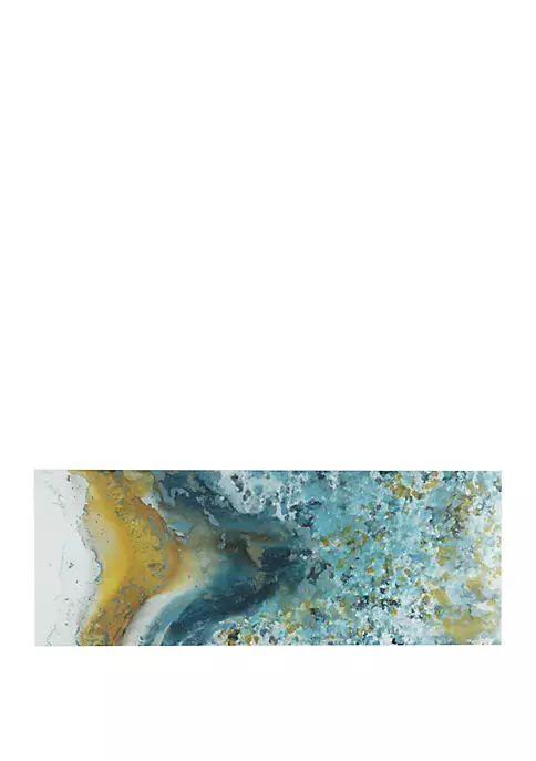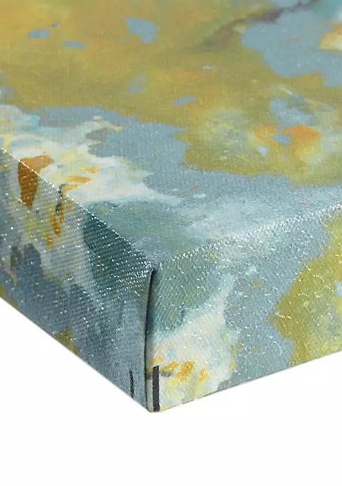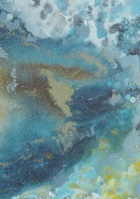 The Shattering Rock Yellow wall art from INK + IVY® depicts an up-close shot inside an agate stone and features a color palette of teal, aqua, silver and yellow. Shattering Rock Yellow is finished off with a heavy gel coat canvas to give added texture to the art.